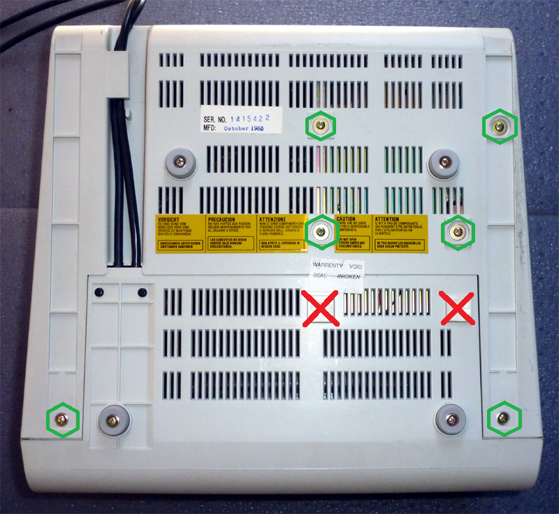 | Note 2: | The case comes apart after removal of two screws topside, and six screws underside. On the underside, do not remove the two screws that are covered (photo), because removal of those together with the remainder will result in the power transformer and its mounting plate coming loose within the case and causing damage. |