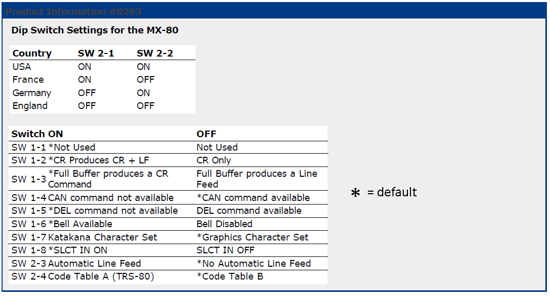 Epson MX-80 printer - Switch settings (dot matrix printer) (tractor feed only)