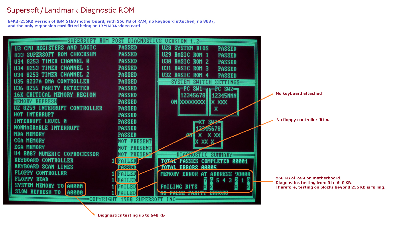 | • | When the Supersoft/Landmark ROM is fitted to an IBM 5160 motherboard, it will test 640 KB of RAM. if you do not have 640 KB fitted (motherboard + expansion card) then the SYSTEM MEMORY TO A0000 test will fail. |