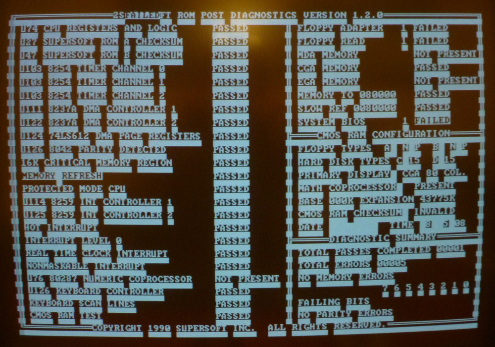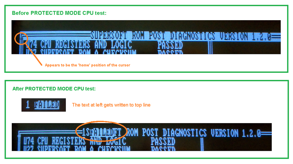 | • | On my fully functional IBM 5170 motherboards, the PROTECTED MODE CPU test does something odd. Three things happen: 1. On the speaker, I hear the error pattern for "Cannot initialize monitor". 2. If I am using an IBM CGA video card, I see what appears to be 'CGA snow'. 3. "1 FAILED" is written to the top line. (photo) The PROTECTED MODE CPU test is then indicated as "PASSED", then testing continues. |